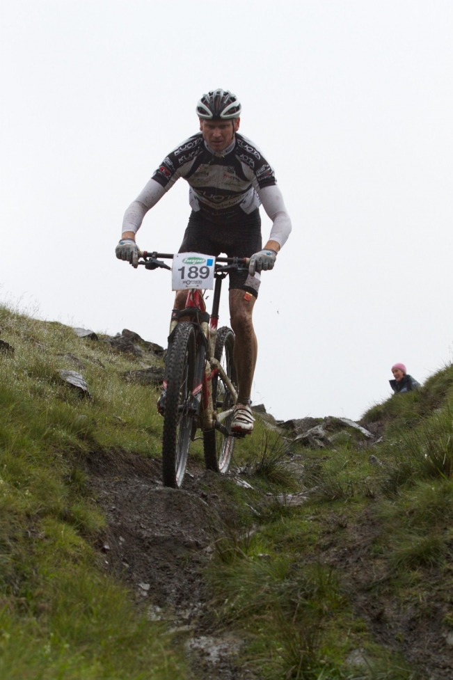 The start for the Leisure Lakes Bikes Racer category was in one of the brief interludes between rain and more rain, Dan Evans (Rhos-on-Sea CC) dominant in race 1 was being challenged by John Hopkinson (Aire Valley Cycles), newcomer David Beskeen (Ghost) and the 2011 series winner Jiri Klekner (Wheelspincycles.co.uk). Dan again dominated in what turned into a set of individual time trials with the order being set in lap one and maintained to the end. An impressive ride by all four in difficult conditions. Almost as impressive as Dave Powell (JMC On-one) who rode 30+ miles from home to race, got a top ten finish and then rode home….. the long way.